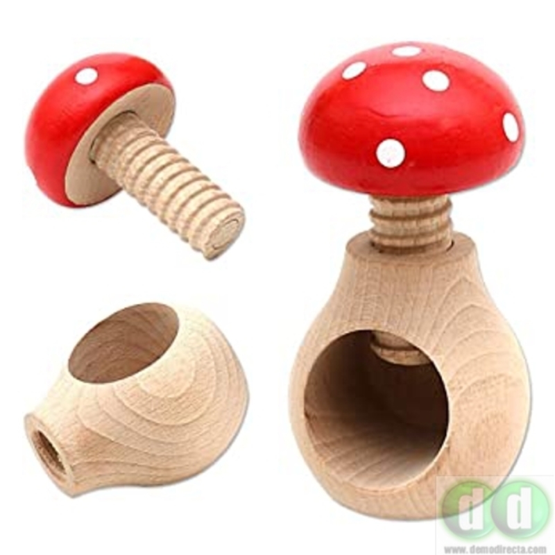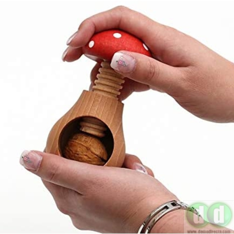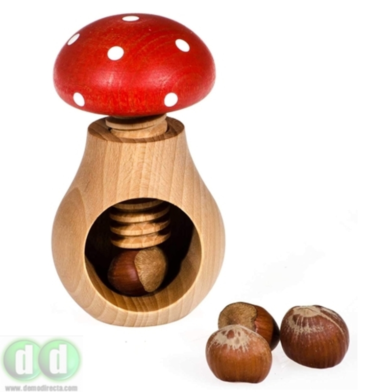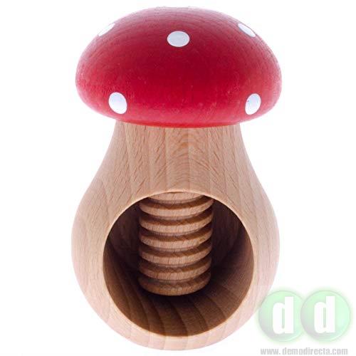 Cascanueces de madera de haya natural con forma de seta venenosa y mecanismo de tornillo. Perfecto para todo tipo de frutos secos. Abrir nueces, avellanas o almendras nunca ha sido tan fácil, gracias a su diseño. Simplemente abra la mano, pose la base y rosque el tornillo que sin esfuerzo presionará la nuez u otro fruto seco y la romperá sin problemas.